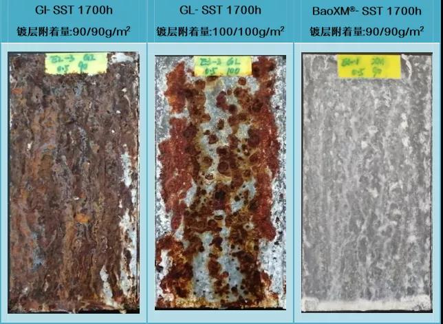 BaoXM®鍍層耐蝕性受切口影響最小,切口耐蝕性較GI、GL更為優(yōu)異。