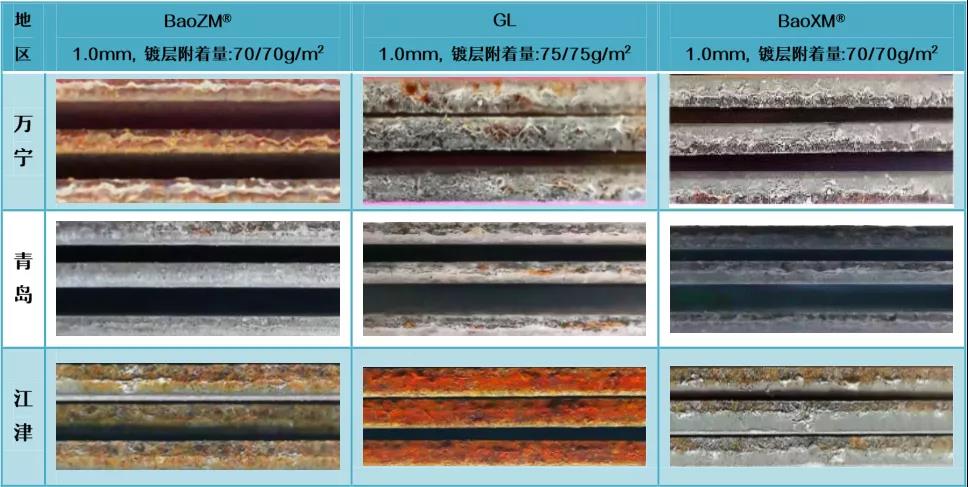 根據(jù)戶外掛片結(jié)果,BaoXM®鍍層在典型海洋氣候、酸雨氣候均表現(xiàn)出較熱鍍鋅、鍍鋁鋅更強的環(huán)境耐蝕性。