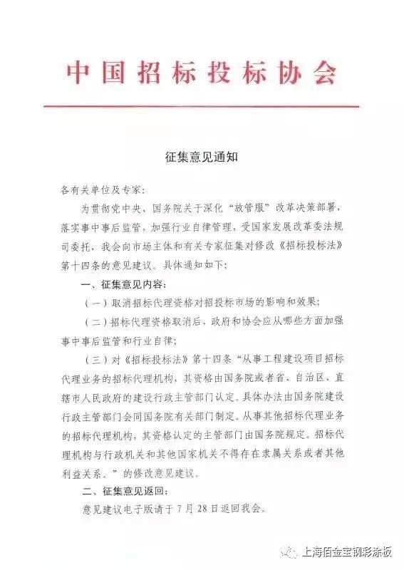 7月31日,受國家發(fā)改委法規(guī)司委托,中國招標(biāo)投標(biāo)協(xié)會將組織市場主體、業(yè)內(nèi)專家學(xué)者,就《招標(biāo)投標(biāo)法》第十四條關(guān)于工程招標(biāo)代理機構(gòu)資質(zhì)管理的條款修訂收集意見。