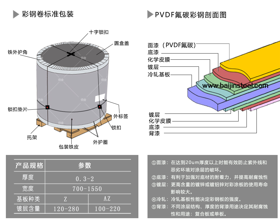 氟碳彩鋼板(PVDF)彩涂板中文學(xué)名聚偏氟乙烯彩涂板,是采用高端的聚偏氟乙烯樹(shù)脂。由于PVDF的化學(xué)鍵與化學(xué)鍵之間,有很強(qiáng)的鍵能,因此涂料具有非常好的防蝕性和色澤保持性,在建筑工業(yè)用彩涂鋼板涂料中,屬于最高級(jí)產(chǎn)品,且分子量大又為直鍵型結(jié)構(gòu),因此除耐化學(xué)藥品性之外,機(jī)械性能,耐紫外線和耐熱性能也很特出。在一般環(huán)境下,基防蝕年限可達(dá)20-25年之久。
