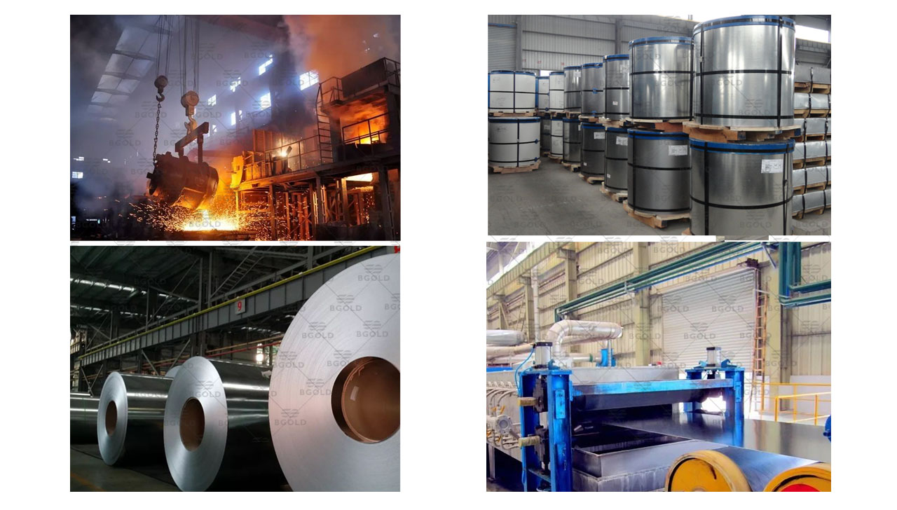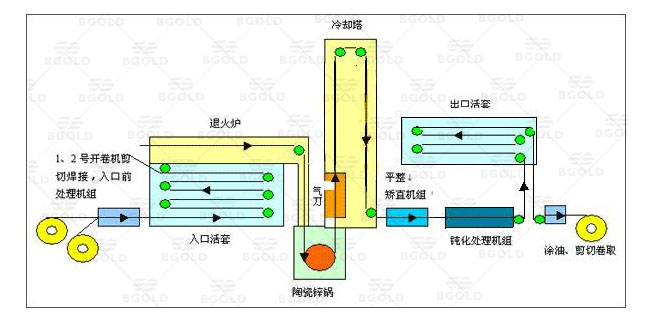 生產(chǎn)加工鍍鋅鋼卷可以分為三大步:首先將整卷帶鋼進(jìn)行酸洗除銹、除污,讓鍍鋅鋼帶表面達(dá)到光亮干凈的效果;酸洗后,通過氯化銨或氯化鋅水溶液或者氯化銨和氯化鋅混合水溶液中進(jìn)行清洗,然后送入熱浸鍍槽內(nèi),進(jìn)行鍍鋅工藝;待鍍鋅工藝完成后即可入庫包裝