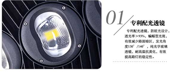 1:專利偏心透鏡,防眩光設(shè)計(jì),透光率> 93%2:蝙蝠形光斑,光照區(qū)域更大,有效減少路面暗區(qū)