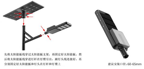 溫馨提示::安裝前請自行準(zhǔn)備好太陽能支架,燈臂,燈桿等