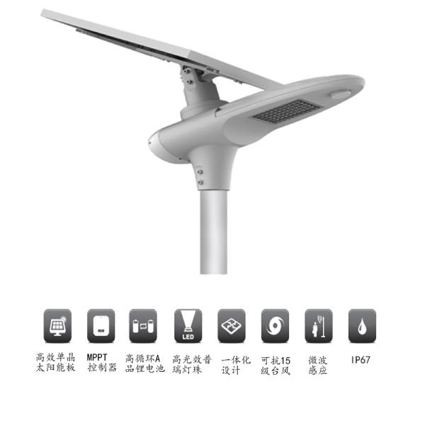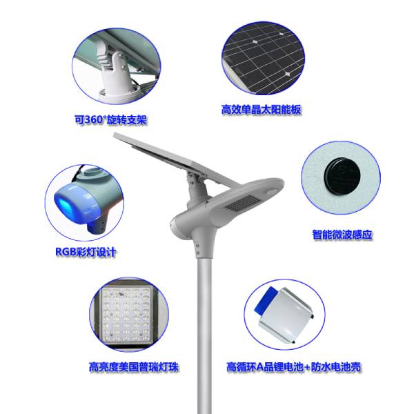弟二代一體化太陽能路燈采用高效單晶光伏板,智能MPPT控制器,長壽命鋰電池,高光效燈珠,集于一體化設(shè)計,安裝使用方便,并擁有微波感應(yīng)和RGB彩燈設(shè)計,實(shí)現(xiàn)多功能亮燈
