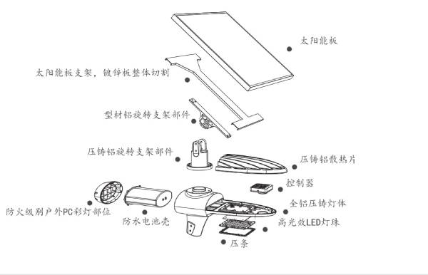 第二代太陽能路燈采用一體式設(shè)計,燈體無打膠,電池有專門的防水盒包裝固定,燈具內(nèi)部結(jié)構(gòu)簡明可靠。對比市場其他不可拆卸替換的同類產(chǎn)品,第二代一體化路燈各組件方便維護(hù)更換,節(jié)省成本。同時所有線材均使用防水公母對插接頭,接頭都有貼標(biāo),具有防接錯功能。造型設(shè)計用心,體現(xiàn)出嚴(yán)謹(jǐn)又人性化的燈具定制精神。